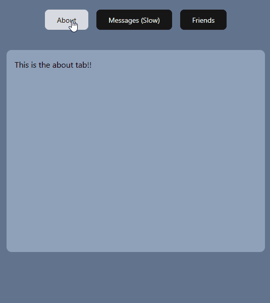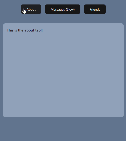 Notice if we now click on the messages button then immediately click on any other button, our app does not wait for the messages tab to render first and immediately we can show the other tab to the user. This is because useTransition has now marked our setCurrentTab call as a transition and it can now be interrupted.